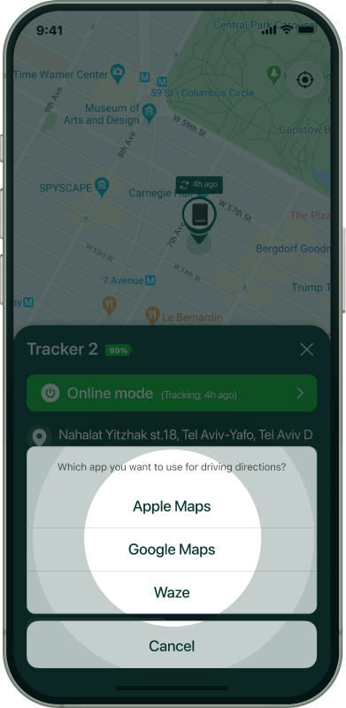 Allows you to get the route to your tracker via third party app maps.