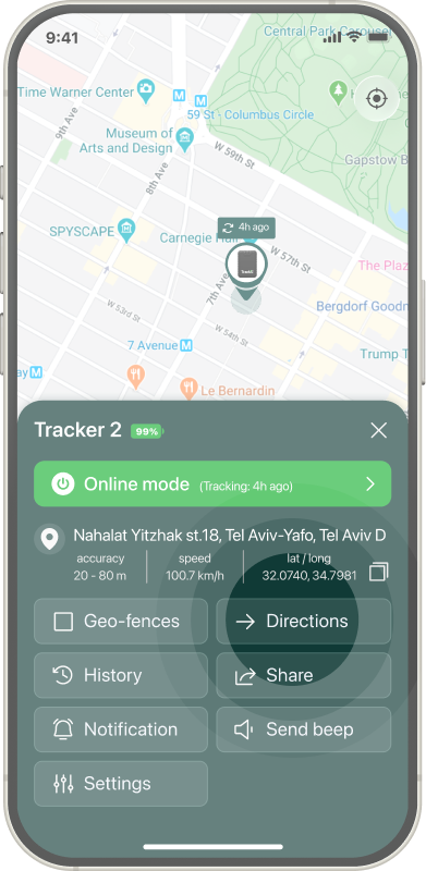 To get the driving direction to your tracker - open the Devices tab and tap on the tracker you want to get the route to.