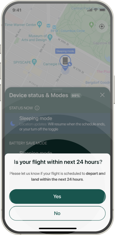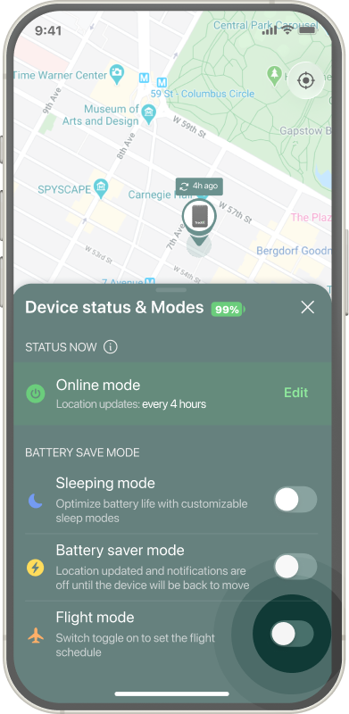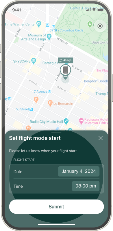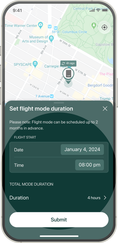 Specify the start and duration of your flight. The tracker will automatically enter flight mode for the defined period.